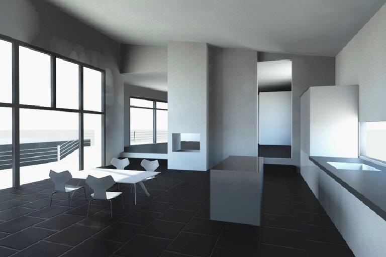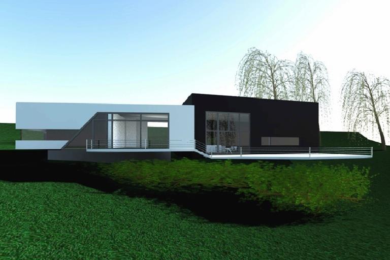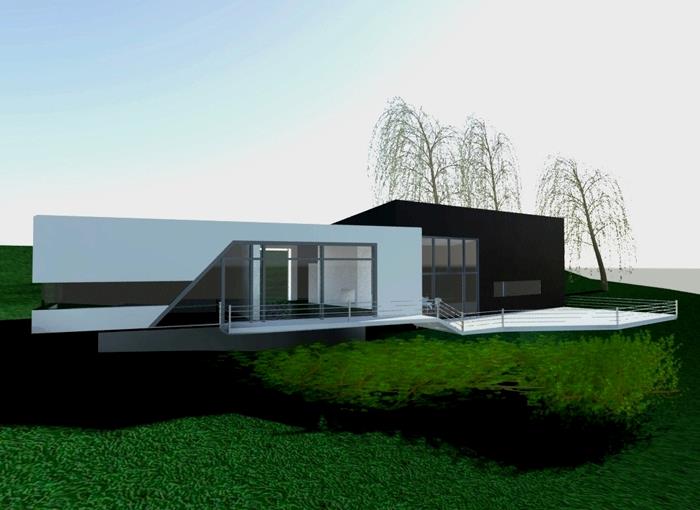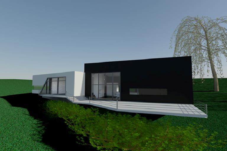 Eksisterende hus forsynes med ny facadebeklædning af naturskifer og nyt tag med listepap.Tilbyningen opføres i gasbeton med indfarvet hvid facadepuds.